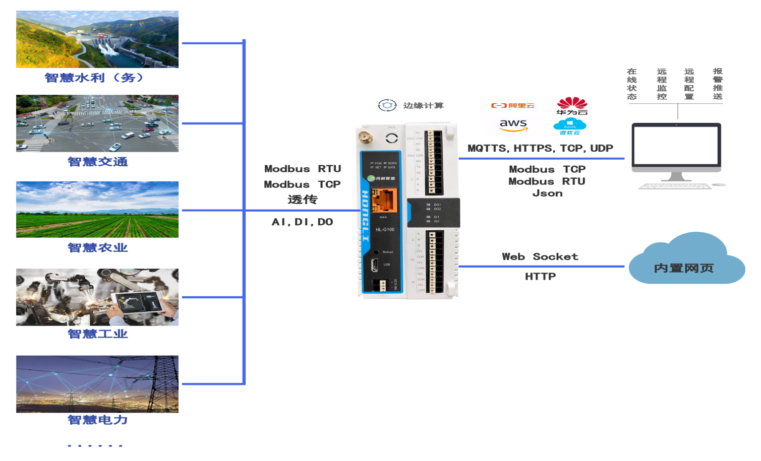 產品支持 TCP/UDP/MQTT(S)/HTTP(S)等協議通信,支持ModbusRTU/TCP協議轉換和Modbus/Json協議數據上報。支持鴻利物聯網云平臺、阿里云和 AWS等常用平臺的接入,方便客戶和平臺的對接。產品在硬件上集成了 2 路 DI,2 路 DO 和2 路 AI,不僅能實現工業現場控制和采集的需求,還能實現根據各種采集點數據或狀態進行聯動控制。可以廣泛應用在智慧水利(務)、智慧交通、智慧電力、智慧工廠、智慧農業等多種工業智能化方案中。