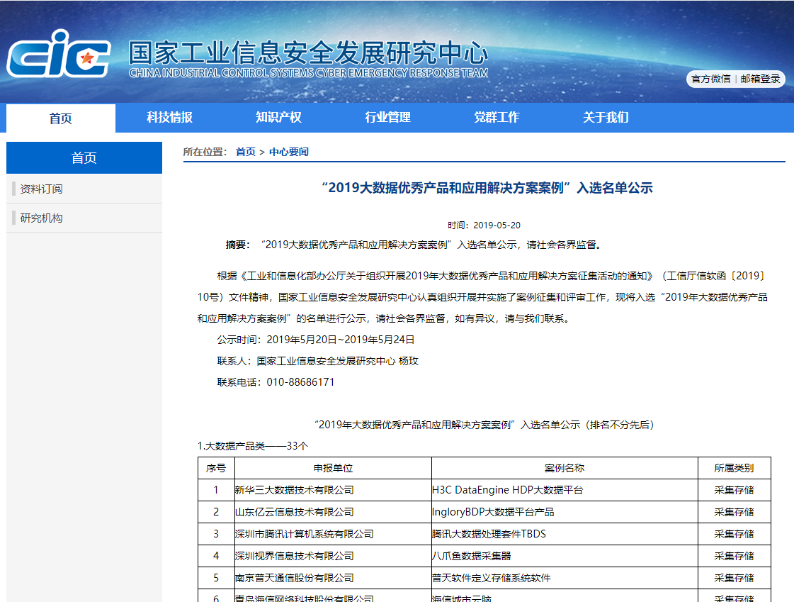 恭喜公司產品入選國家工信部的大數據應用解決方案