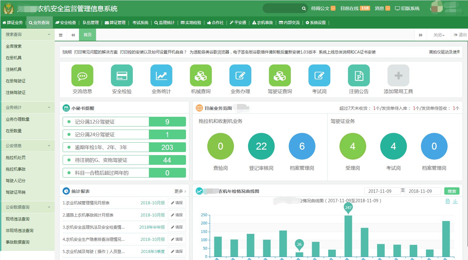 按照農業部印發的《拖拉機和聯合收割機駕駛證業務工作規范》和《拖拉機和聯合收幾登記業務工作規范》(農機發[2018]2 號)要求,結合省級農機監理工作需求,以實用先進為原則,充分體現“農民少走路,數據多跑路”等原則,采用新一代互聯網、云計算和大數據分析等現代信息技術,研發出省級農機安全監理云平臺信息系統。